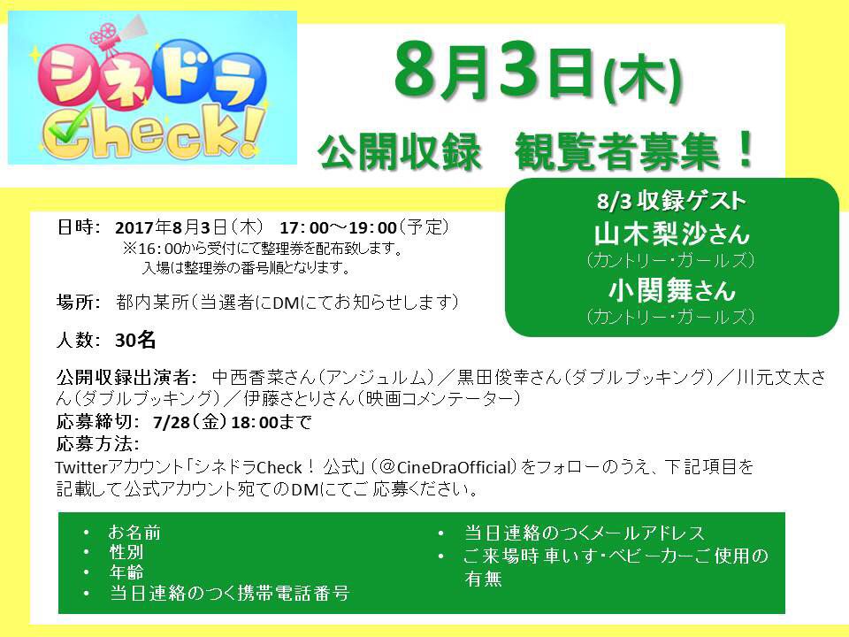 なんと!8/3に #シネドラCheck!は抽選で30名様をご招待の上公開収録を実施します!ハロプロゲストはカントリー・ガールズから、山木梨沙さんと小関舞さんが来てくださることが決定しました〜✨