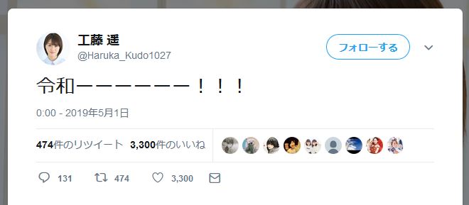 工藤遥が一言「令和」とツイートしただけで3300いいねwwwww