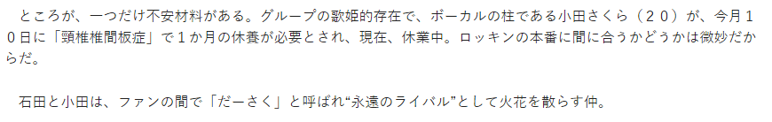 ところが、一つだけ不安材料がある。グループの歌姫的存在で、ボーカルの柱である小田さくら(20)が、今月10日に「頸椎椎間板症」で1か月の休養が必要とされ、現在、休業中。ロッキンの本番に間に合うかどうかは微妙だからだ。