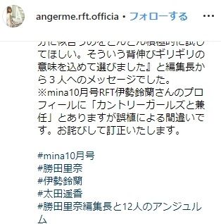 ※mina10月号伊勢鈴蘭さんのプロフィールに「カントリーガールズと兼任」とありますが誤植による間違いです。お詫びして訂正いたします