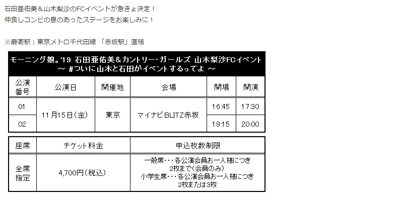 ★ファンクラブ会員限定イベント★「モーニング娘。’19 石田亜佑美&カントリー・ガールズ 山木梨沙FCイベント ~ #ついに山木と石田がイベントするってよ ~」開催決定!