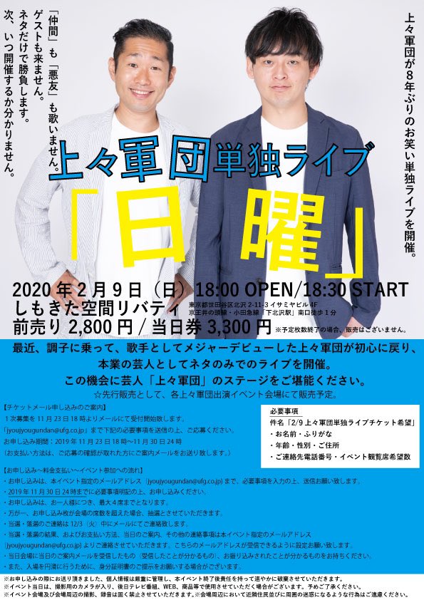 タイトル:上々軍団 単独ライブ「日曜」日時:2020年2月9日(日)18:00OPEN / 18:30START会場:しもきた空間リバティ(東京都世田谷区北沢2-11-3 イサミヤビル4F)京王井の頭線・小田急線「下北沢駅」南口徒歩1分前売り料金:¥2,800(税込み)当日料金:,300(税込み)※予定枚数終了の場合販売はありません。