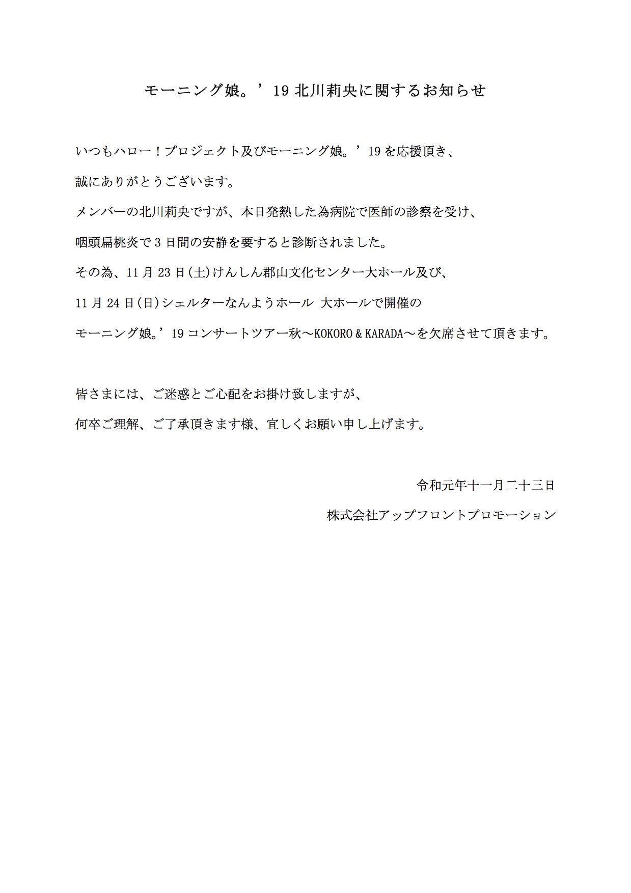 【モーニング娘。’19 北川莉央に関するお知らせ】 pic.twitter.com/TJB4m20q1x