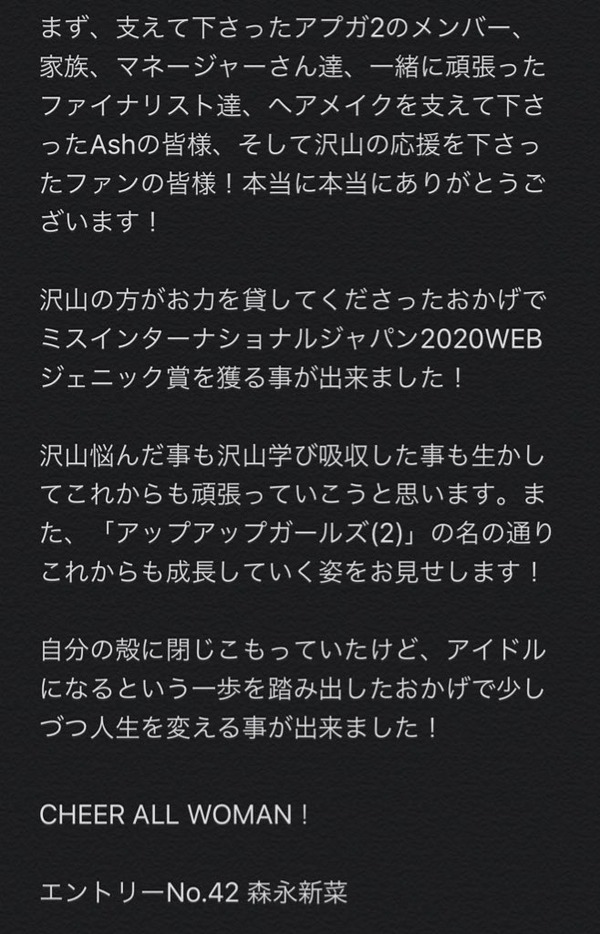 アップアップガールズ(2)森永新菜がミスインターナショナル特別賞「WEBジェニック賞」を受賞!