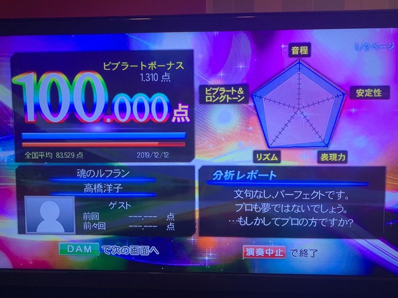 段原 カラオケで魂のルフラン歌って100点取る!!!!!