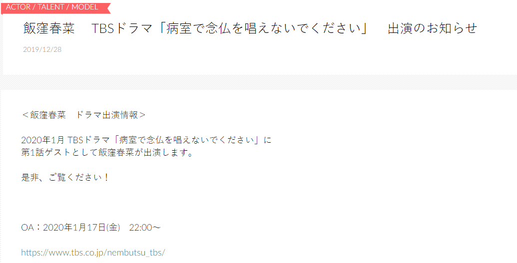 2020年1月 TBSドラマ「病室で念仏を唱えないでください」に第1話ゲストとして飯窪春菜が出演します。