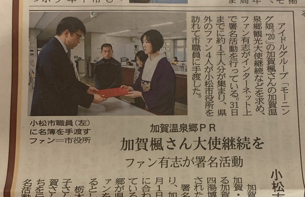 モーニング娘。加賀楓の加賀温泉郷観光大使継続を要望する署名をファン有志が小松市観光文化課に提出