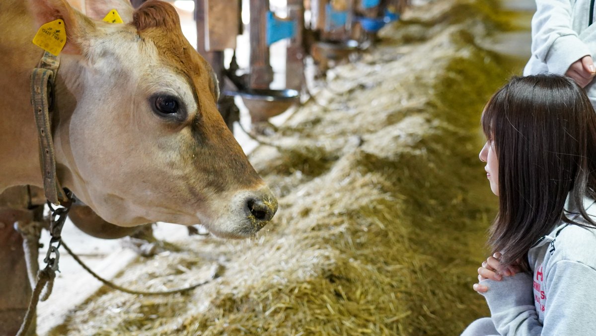 牛と見つめ合うモーニング娘。佐藤優樹
