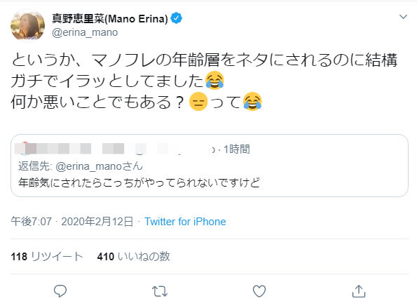 【朗報】真野恵里菜「マノフレの年齢層をネタにされるのに結構ガチでイラッとしてました。何か悪いことでもある?って」