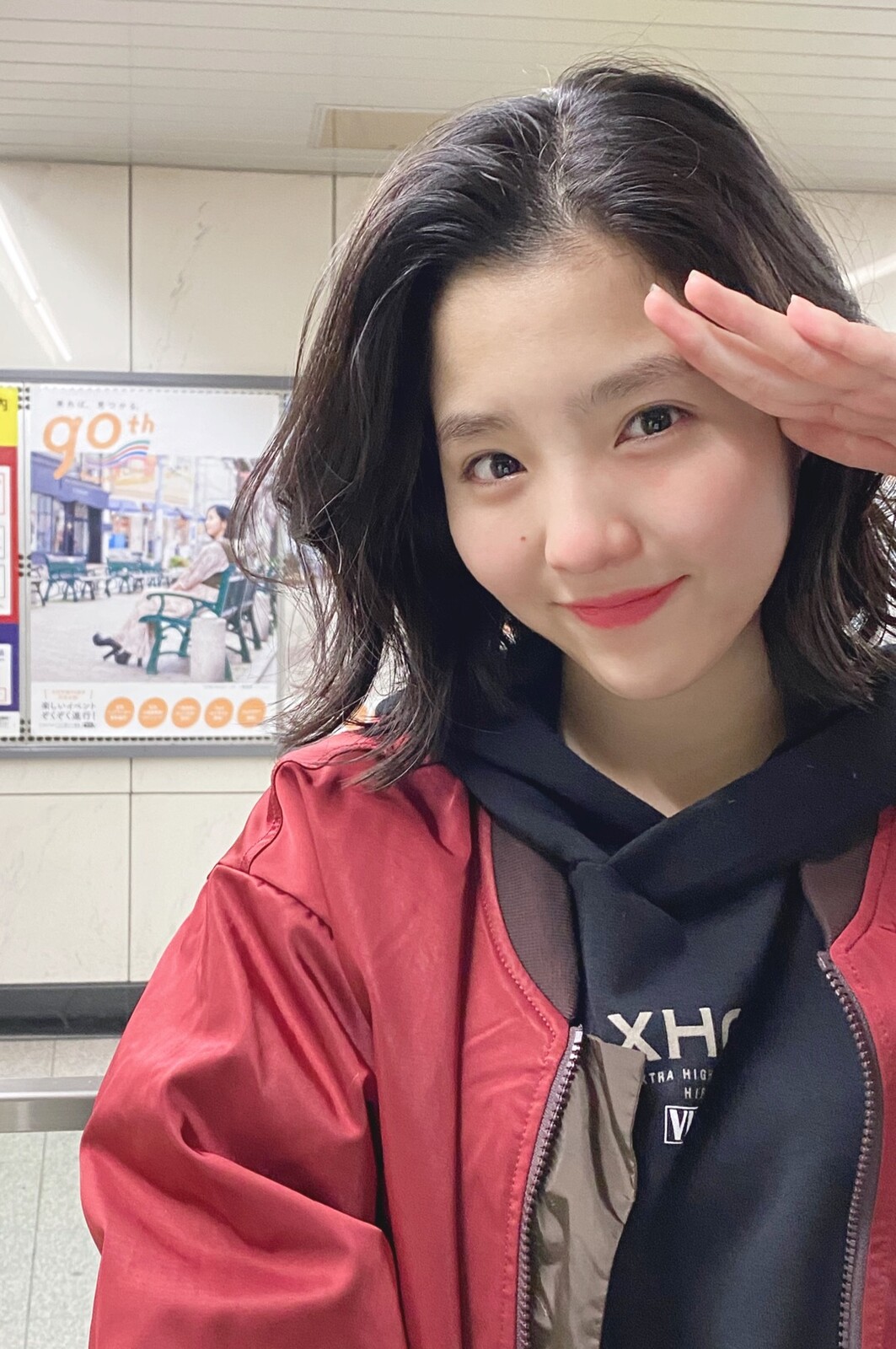 BEYOOOOONDS一岡伶奈、自分が写っている京急大井町線のポスターを見つけたから一緒に写りたいけど恥ずかしくてとんでもなく遠くから撮る