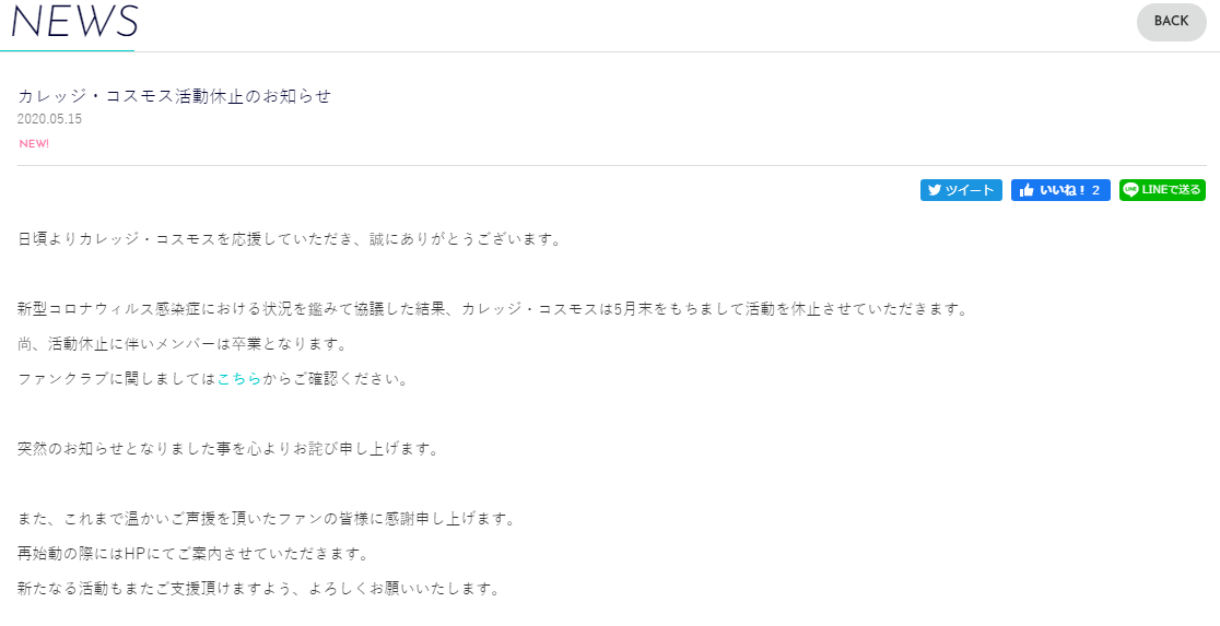 【速報】カレッジ・コスモス活動休止のお知らせ