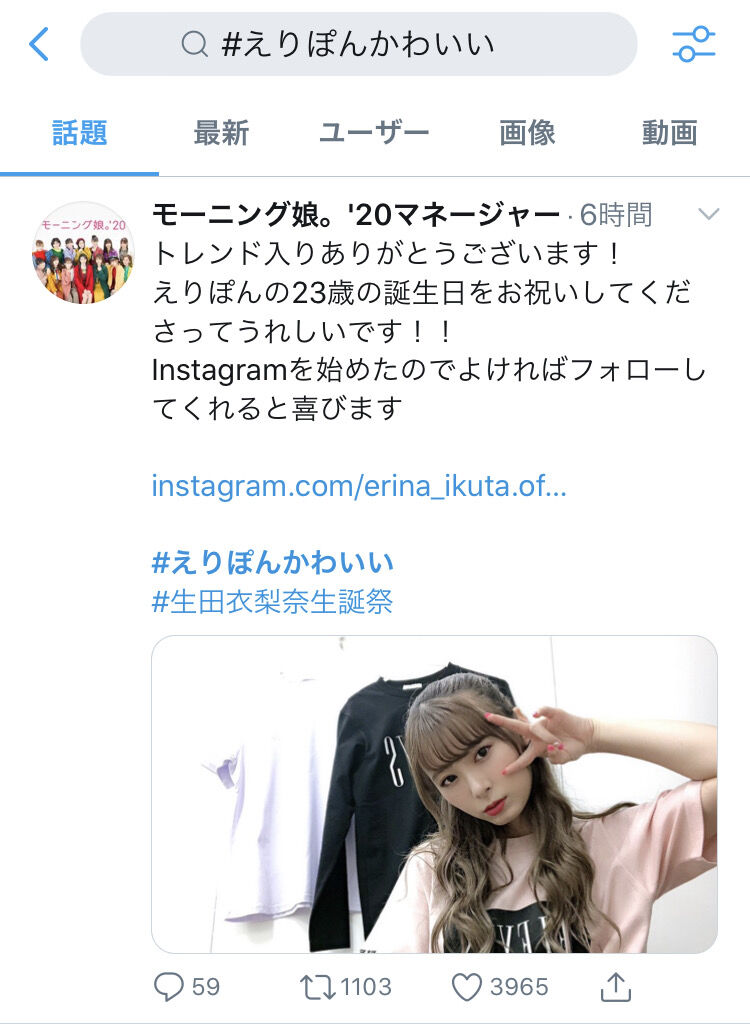 Instagramを始めたのでよければフォローしてくれると喜びますhttps://t.co/txUj3a473z#えりぽんかわいい#生田衣梨奈生誕祭 pic.twitter.com/iIDNoIPXI1— モーニング娘。’20マネージャー (@MorningMusumeMg) July 6, 2020