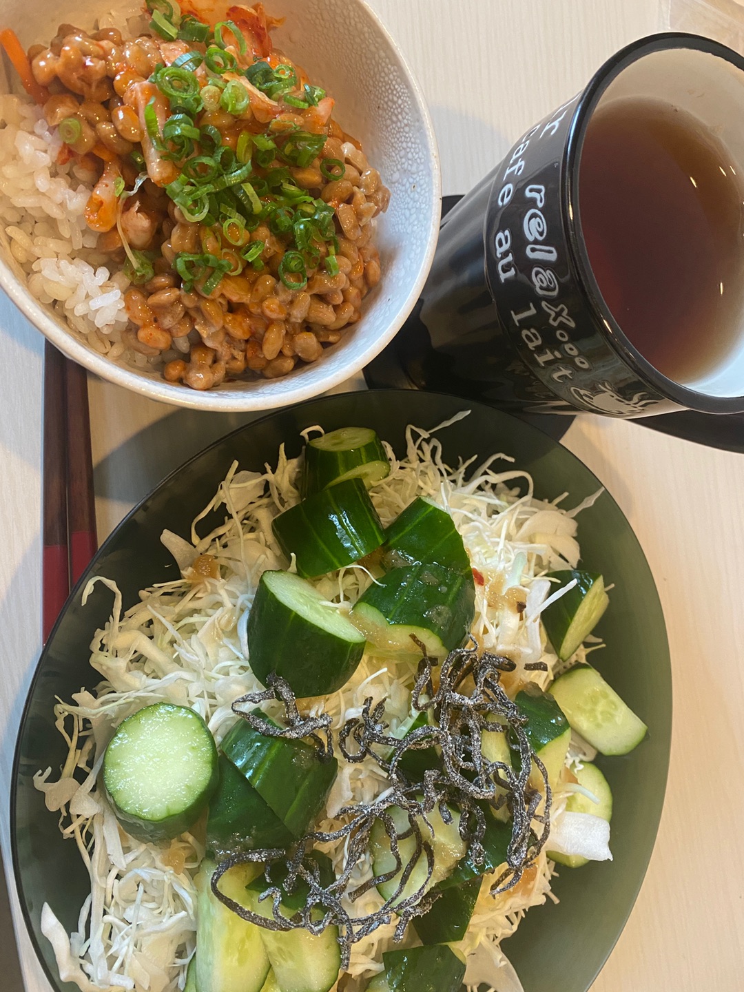 ヘルシーなんやけど、炭水化物とろうと思ってもち麦入りのご飯も食べました 納豆キムチのっけてね