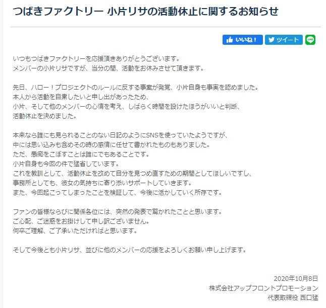 つばきファクトリー 小片リサの活動休止に関するお知らせ