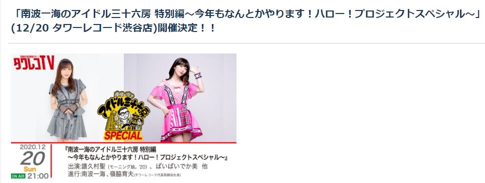 「南波一海のアイドル三十六房 特別編~今年もなんとかやります!ハロー!プロジェクトスペシャル~」(12/20 タワーレコード渋谷店)開催決定!!