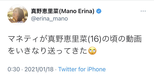 真野恵里菜(29)「マネティが真野恵里菜(16)の頃の動画をいきなり送ってきた🙄」