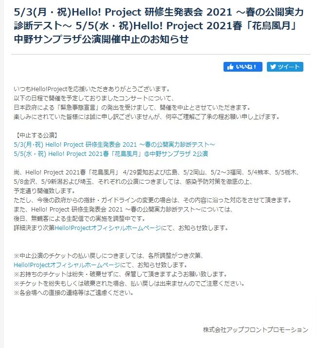 5/3(月・祝)Hello! Project 研修生発表会 2021 ?春の公開実力診断テスト? 5/5(水・祝)Hello! Project 2021春「花鳥風月」中野サンプラザ公演開催中止のお知らせ