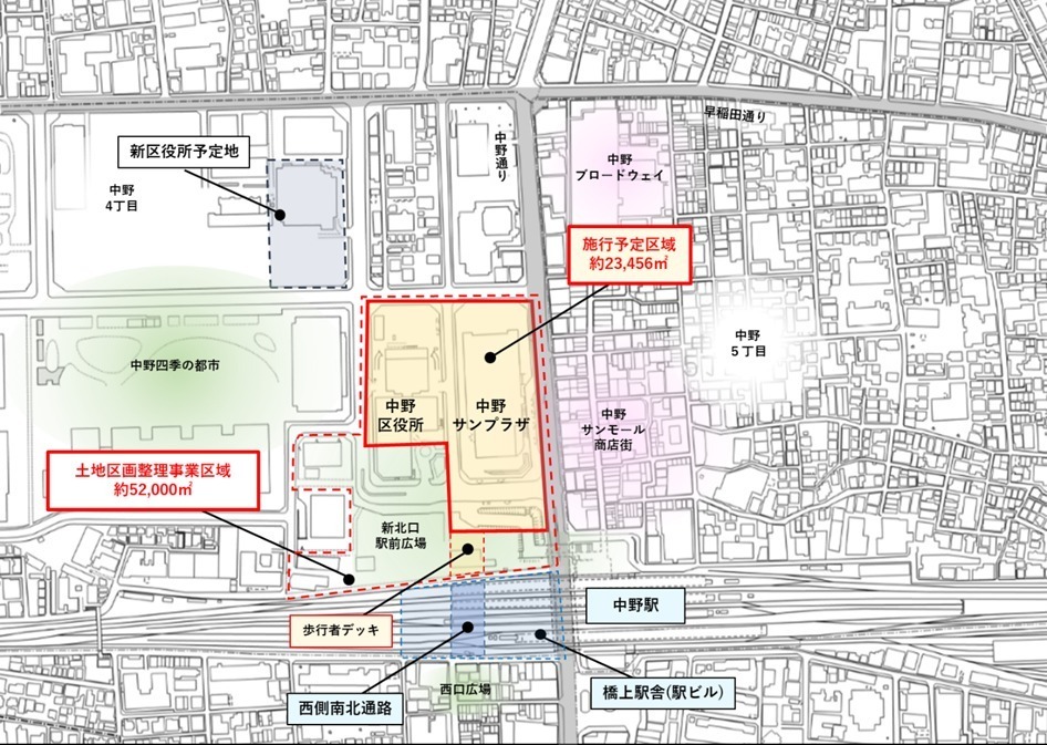 野村不動産株式会社を代表とするグループ(代表事業者:野村不動産株式会社、共同事業者:東急不動産株式会社、住友商事株式会社、ヒューリック株式会社及び東日本旅客鉄道株式会社)は、中野区とともに推進する「中野駅新北口駅前エリア拠点施設整備事業」において、2021年5月6日に中野区と基本協定書を締結いたしました。今後は、個人施行予定者として事業に参画し、2022年度末の都市計画決定・2028年度内の竣工を目指してまいります。本事業は、 中野駅北口エリアの2ヘクタールを超える大規模な敷地において行われる、 ホール・オフィス・住宅・商業・ホテルなどにより構成される複合再開発事業です。 音楽、 サブカルチャー、 食など多様な文化を育んできた中野駅周辺の回遊性を高めることでさらに賑わいと交流を創出し、 立地特性を最大限に活かした拠点施設整備を行うことによって、 グローバルな都市活動拠点の形成や地域経済の活性化に寄与していくことが期待されています。 また、 本事業は同エリアの象徴的な存在である中野サンプラザの機能を再整備する事業でもあることから、 文化を原動力としたまちづくりを目指し生活・産業・交流を活性化させるため整備を図ってまいります。