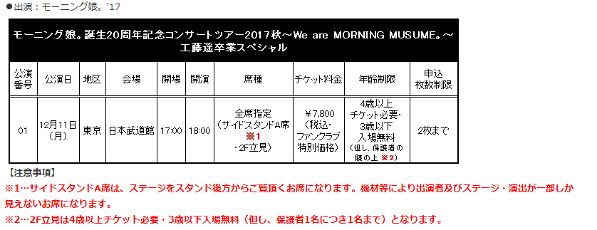 「モーニング娘。誕生20周年記念コンサートツアー2017秋~We are MORNING MUSUME。~工藤遥卒業スペシャル~」のサイドスタンドA席・2F立見受付が決定しました!