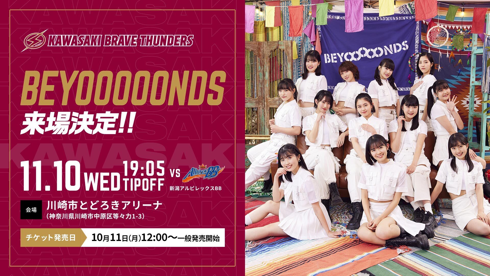 11月10日(水)の新潟アルビレックスBB戦(会場 : 川崎市とどろきアリーナ)に、「BEYOOOOONDS(ビヨーンズ)」の来場が決定いたしました。