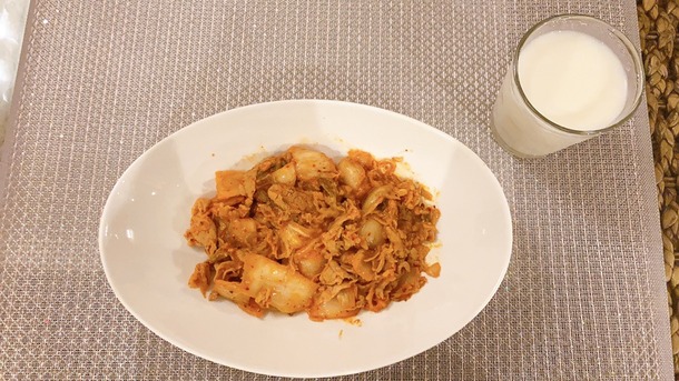 八木栞ちゃん、さっそく石田直伝の豚キムチを作る