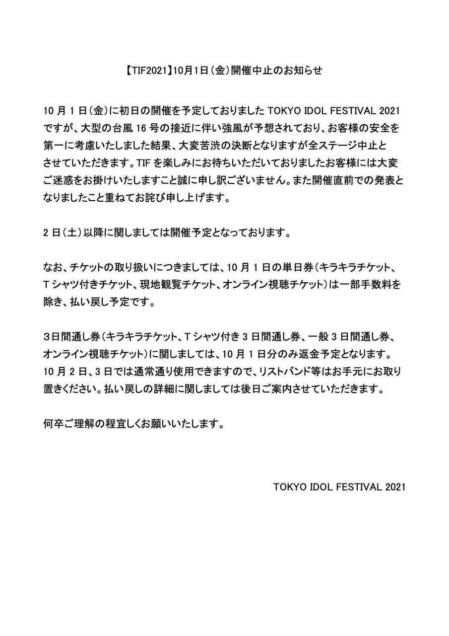 10/1に開催予定でしたTIF2021ですが台風16号の接近に伴いお客様の安全を第一に考慮した結果、全ステージ中止とさせていただきます。開催直前での発表となりましたことお詫び申し上げます。詳細に関しましては添付の資料をご確認ください。