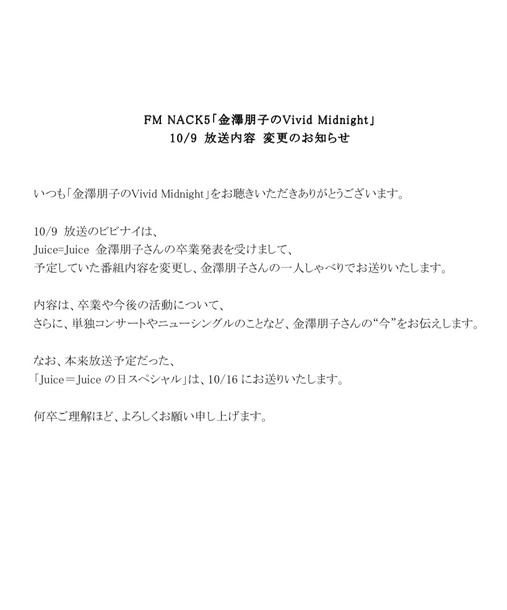 NACK5「金澤朋子のVivid Midnight」に関する大切なお知らせ