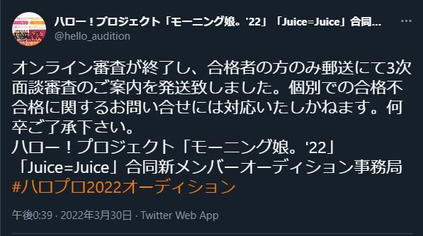 ハロー!プロジェクト「モーニング娘。’22」「Juice=Juice」合同新メンバーオーディション事務局