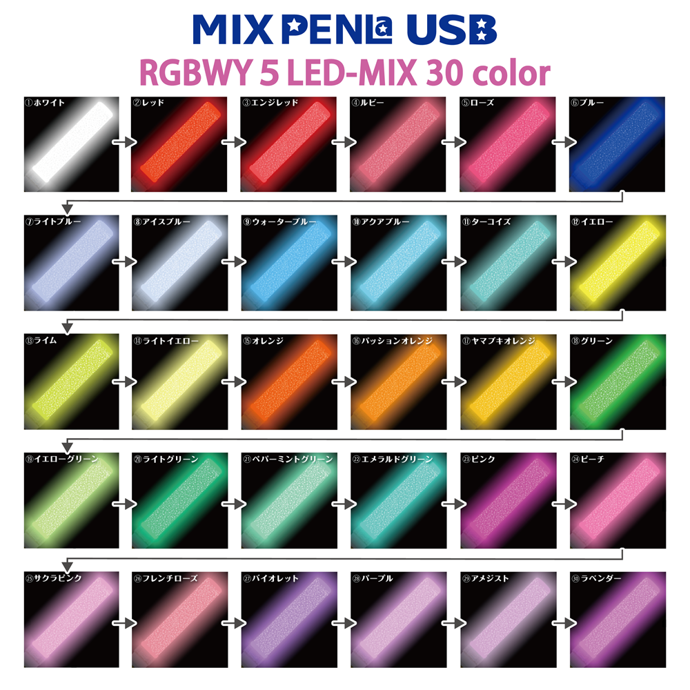 ターンオン独自開発のペンライト専用LEDを5色搭載しているので、黄・白・オレンジ・ピンク・水色系の発色抜群!!