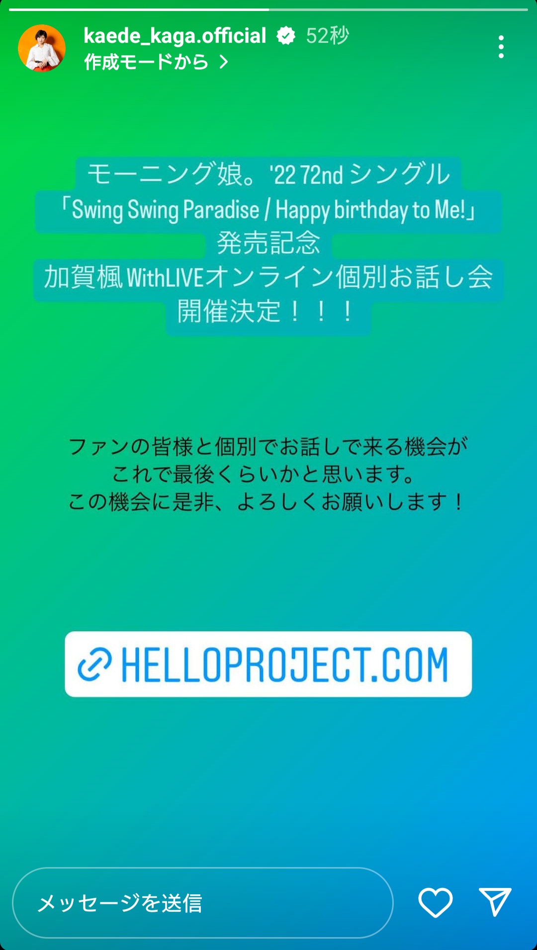 【速報】加賀楓さん「私と皆さんがお話しできる機会については今日発表されたオンラインお話し会が最後くらいかな~」