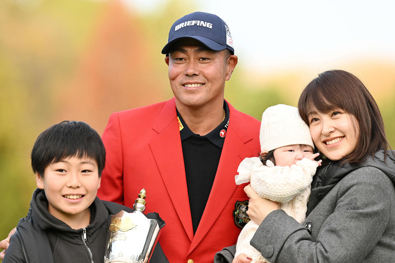 優勝を決めた谷原(左から2人目)は家族と記念撮影する。左から長男の悠人君、1人おいて長女の悠香ちゃん、元ココナッツ娘。で妻の絢香さん