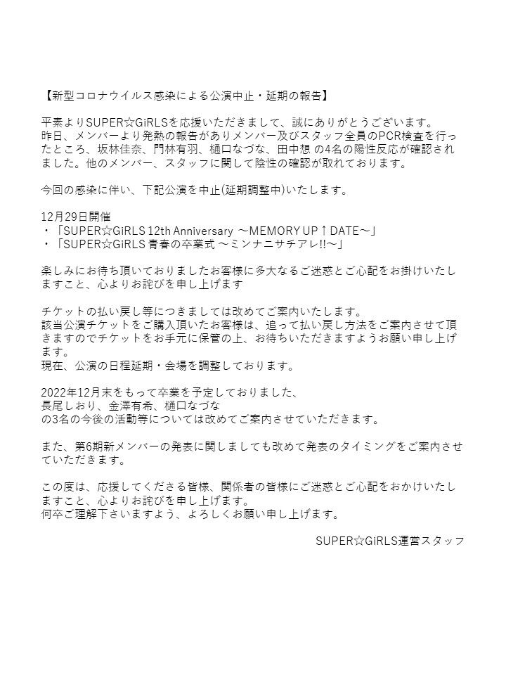 SUPER☆GiRLSメンバー内に新型コロナウイルスの陽性感染が確認されたため、