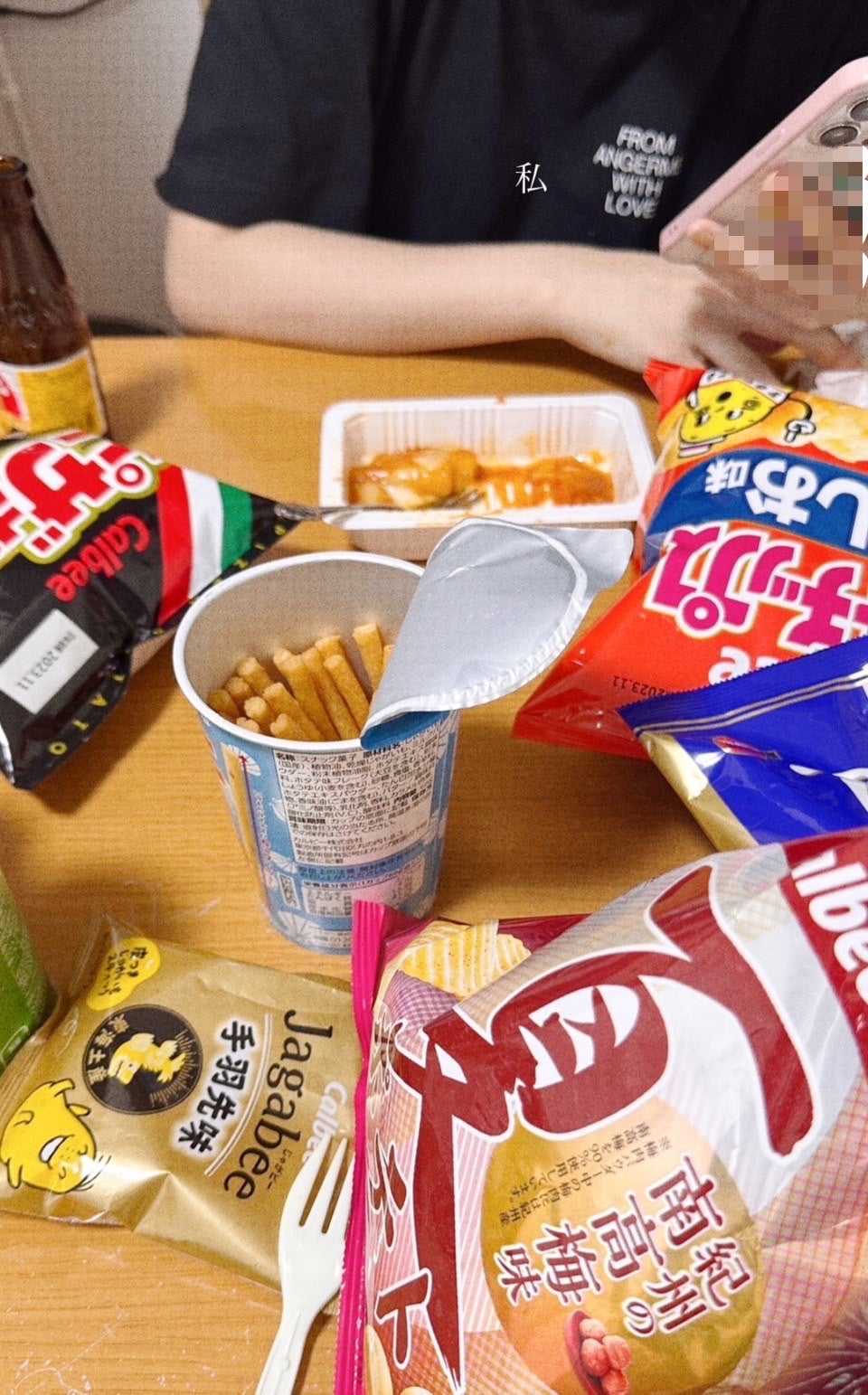 最初1人で爆食しようと思って、コンビニでポテチ3袋、じゃがりこ1個、プリングルス1個、チョコ系2袋…トッポギ等………(苦笑)