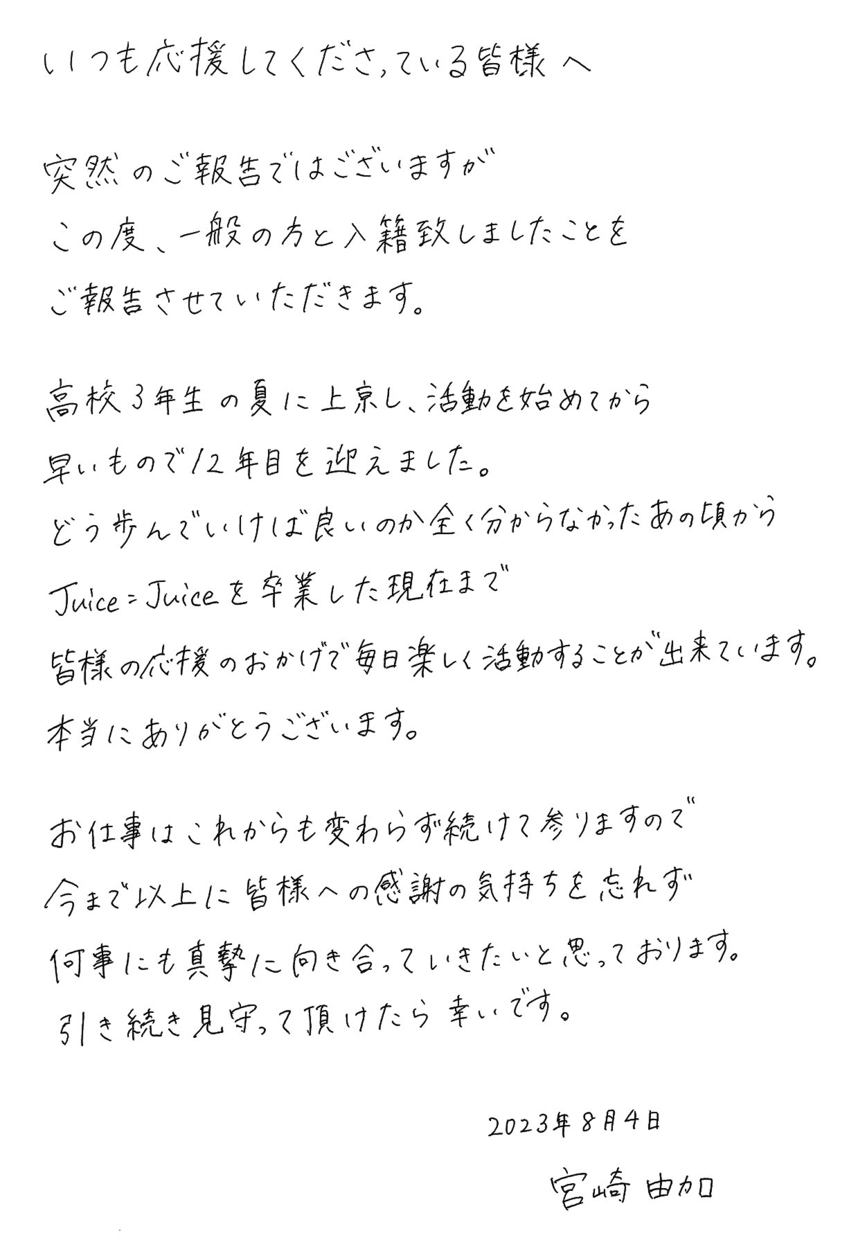 宮崎由加、結婚のお知らせ