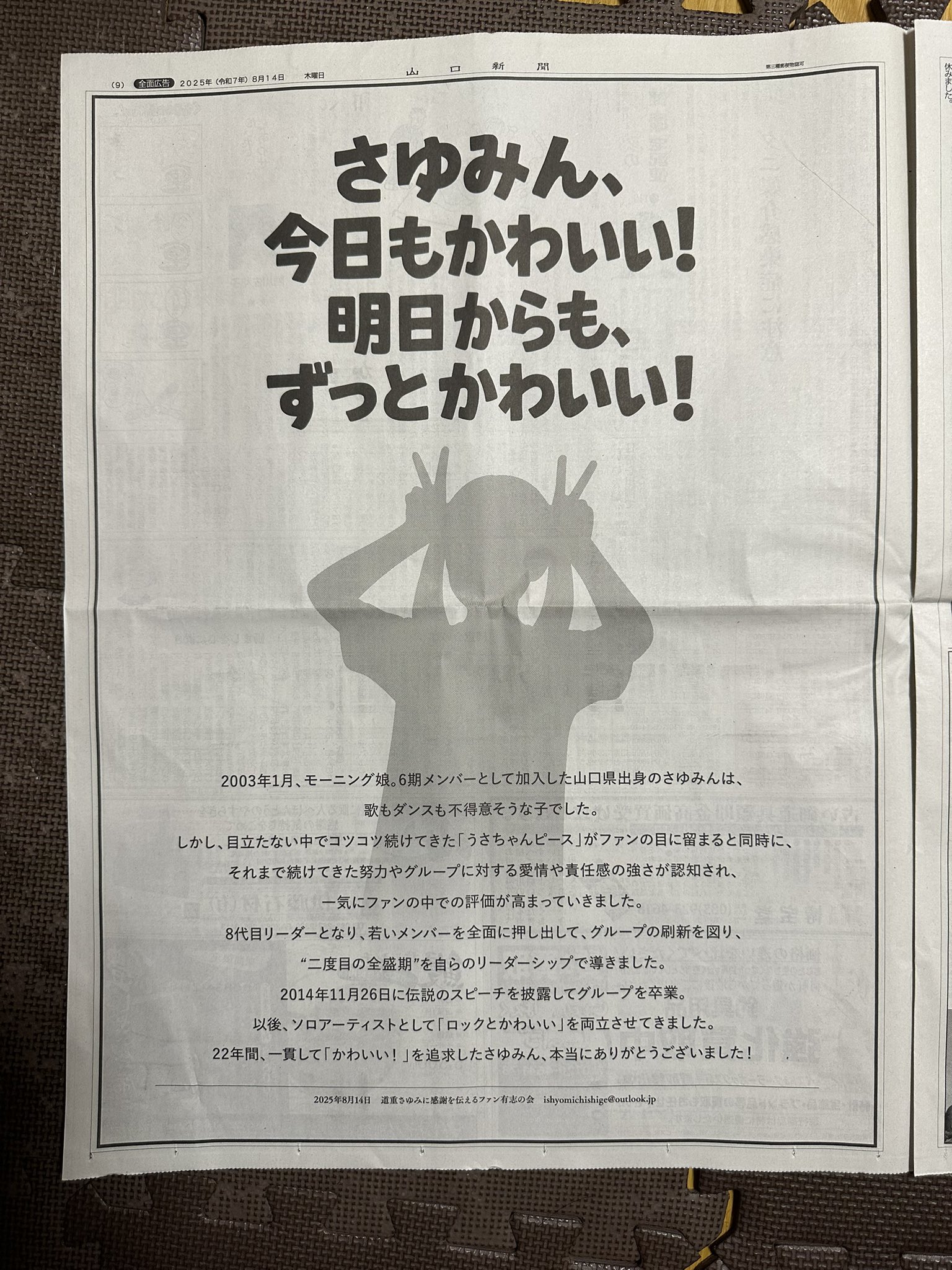 本日、8月14日の山口新聞に道重さゆみさんへの感謝の広告を掲載しました。