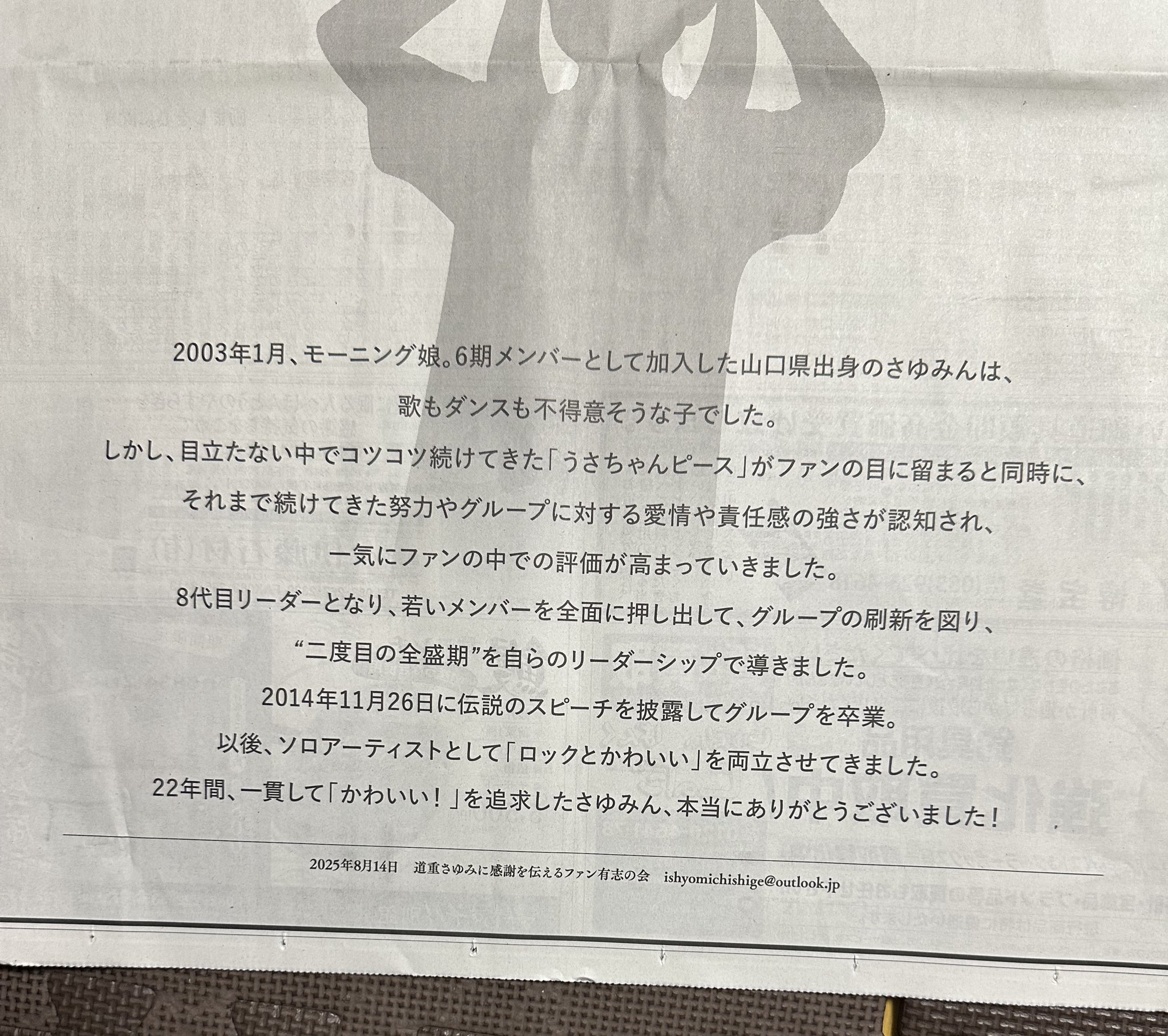 【画像】道重さゆみさんに感謝を伝えるファン有志の会、新聞一面広告を出す!!