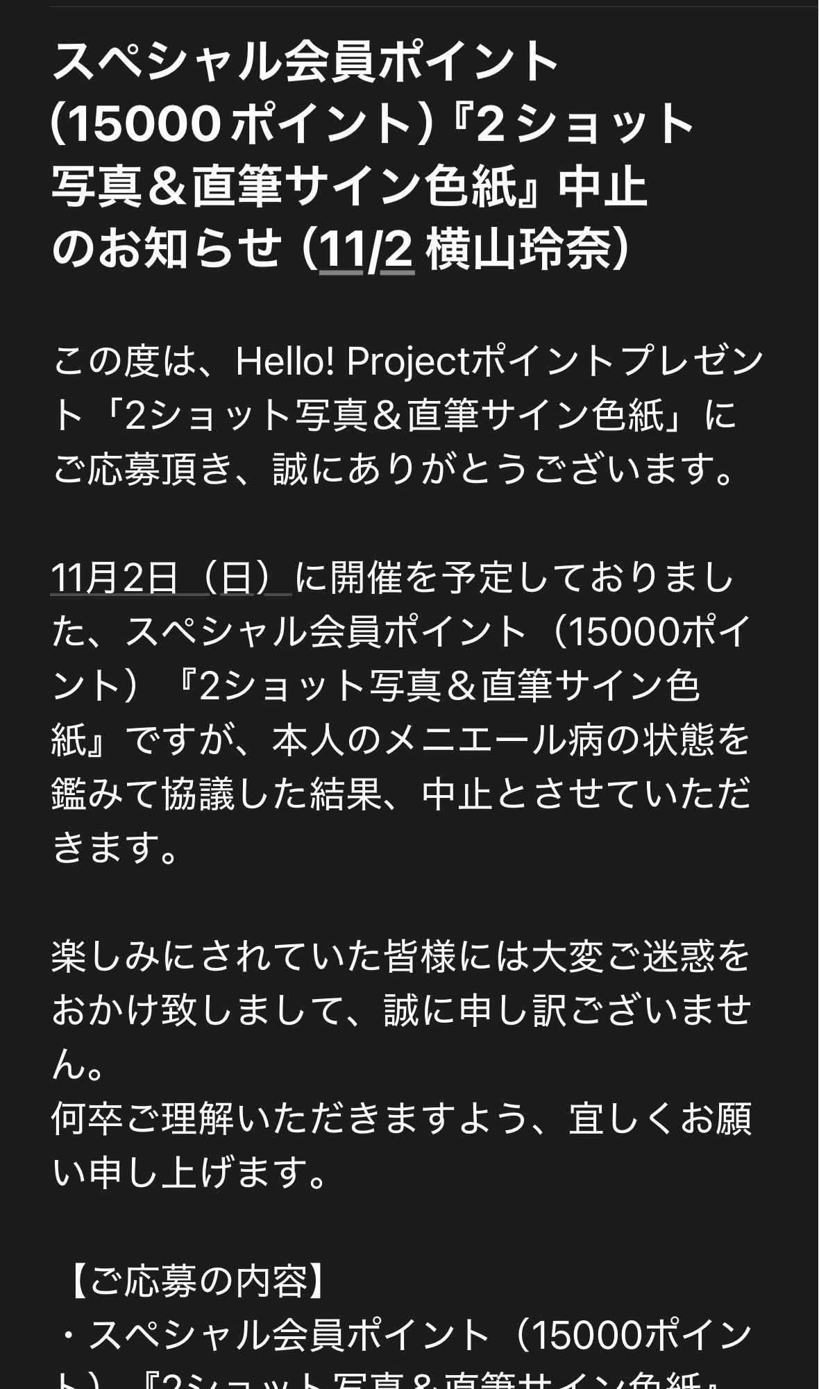 【悲報】横山玲奈さん、FCイベントでの2ショット撮影中止のお知らせ