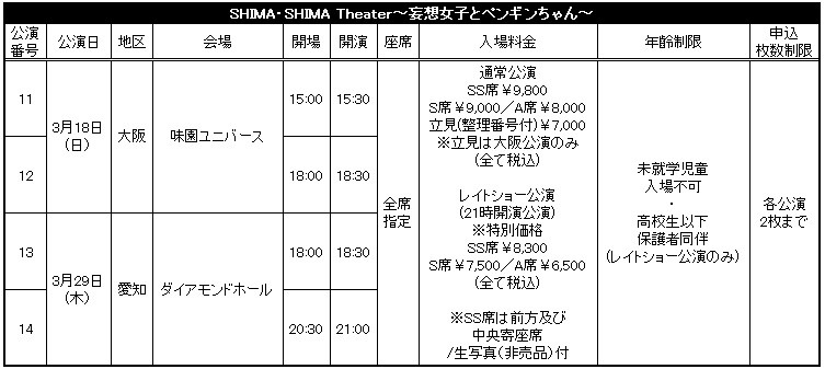 「SHIMA・SHIMA Theater~妄想女子とペンギンちゃん~」大阪・名古屋公演FC先行受付のお知らせ