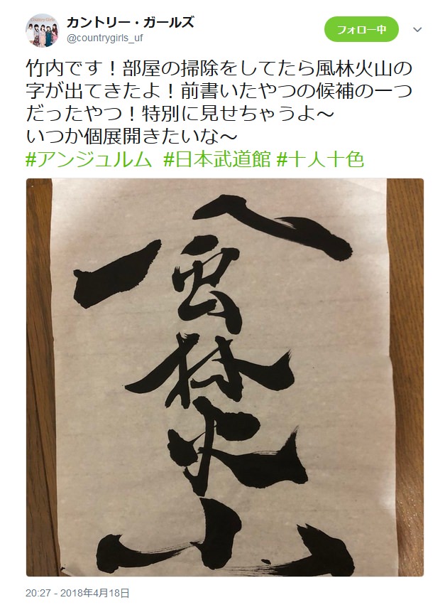 “竹内です!部屋の掃除をしてたら風林火山の字が出てきたよ!前書いたやつの候補の一つだったやつ!特別に見せちゃうよ〜