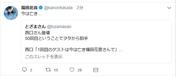 50回目ということでヲタから拍手西口「1回目のゲストは今は亡き福田花音さんで」