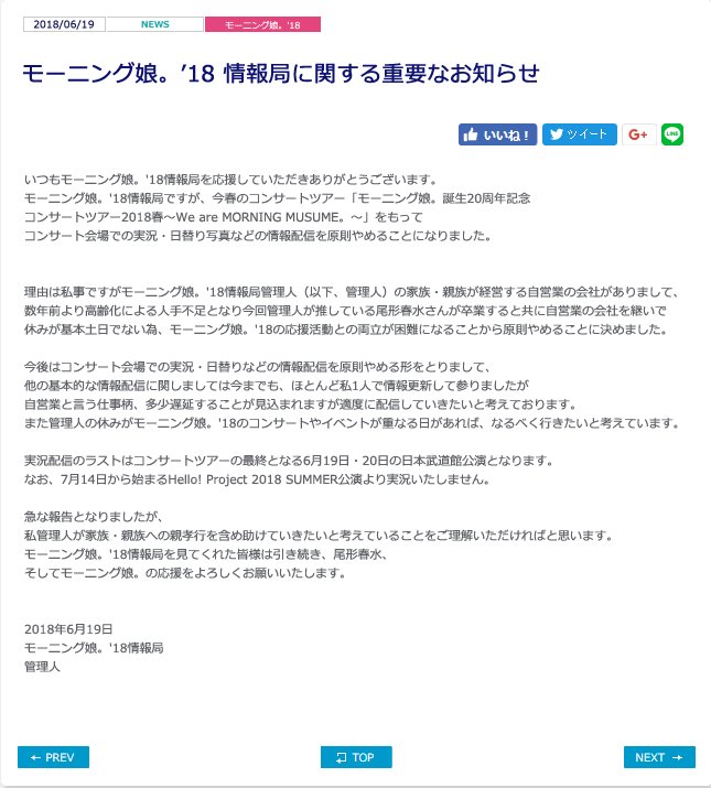 モーニング娘。'18情報局に関する重要なお知らせ