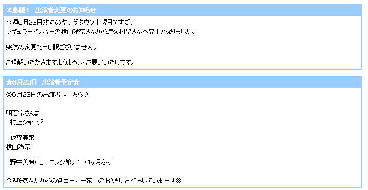 【悲報】ヤングタウン土曜日、出演者変更のお知らせ