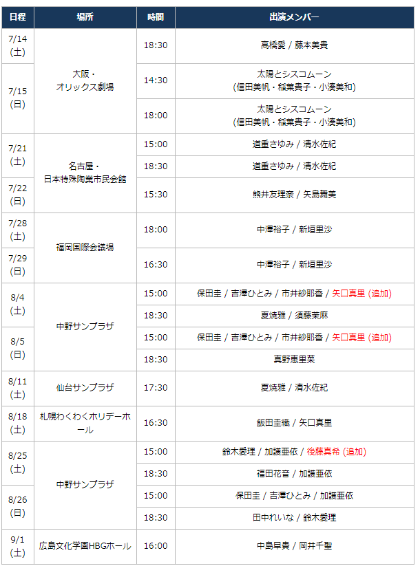 (土) 中野サンプラザ 15:00 保田圭 / 吉澤ひとみ / 市井紗耶香 / 矢口真里 (追加)