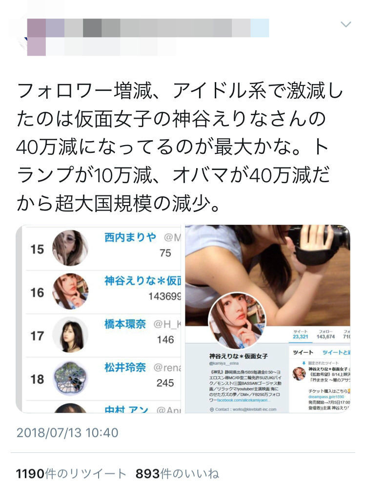 仮面女子の神谷えりなさん、フォロワー110万→70万に激減