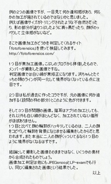 結論として内容の真偽はともかく、2枚とも編集加工が施されており信憑性はないと言えます。今更蒸し返したくはないですが、コラで批判されたままではたぐっちも気の毒なので。”