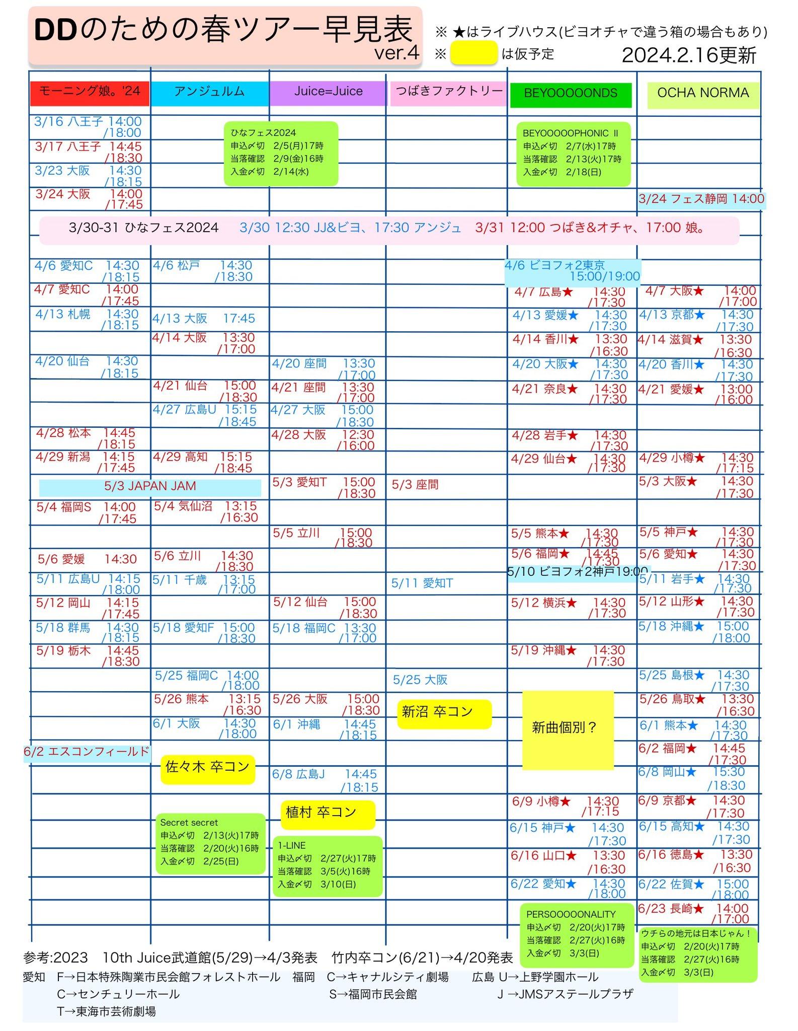 6/2娘。エスコン、J=J春ツアー追加しました。J=Jだけ広島がJMS(娘。アンジュは上野学園)なので気をつけてください⚠️