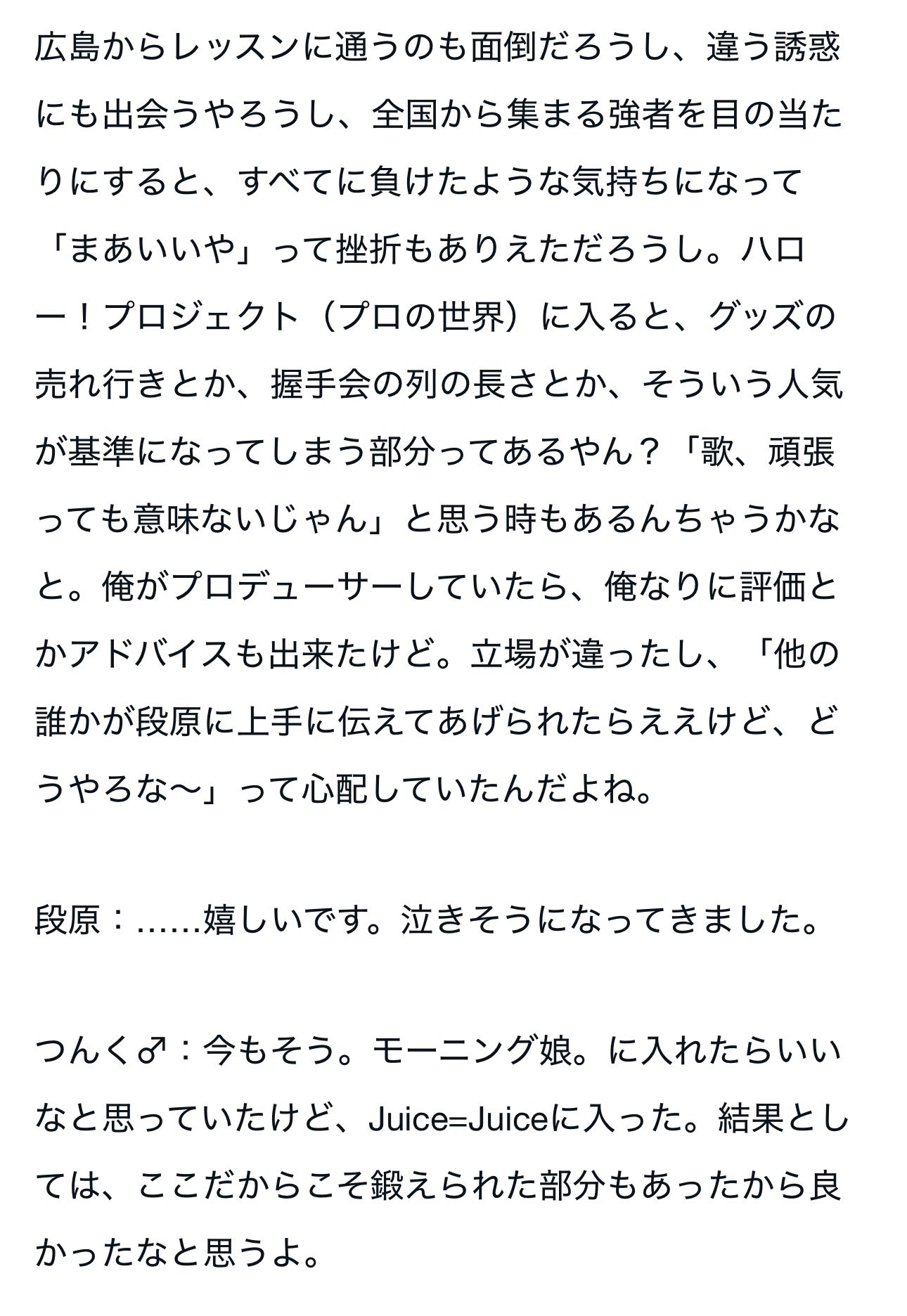 つんくが段原さんを直接指導したいって言ったことあったっけ?と思ったら、2024年2月のつんくjuice対談で