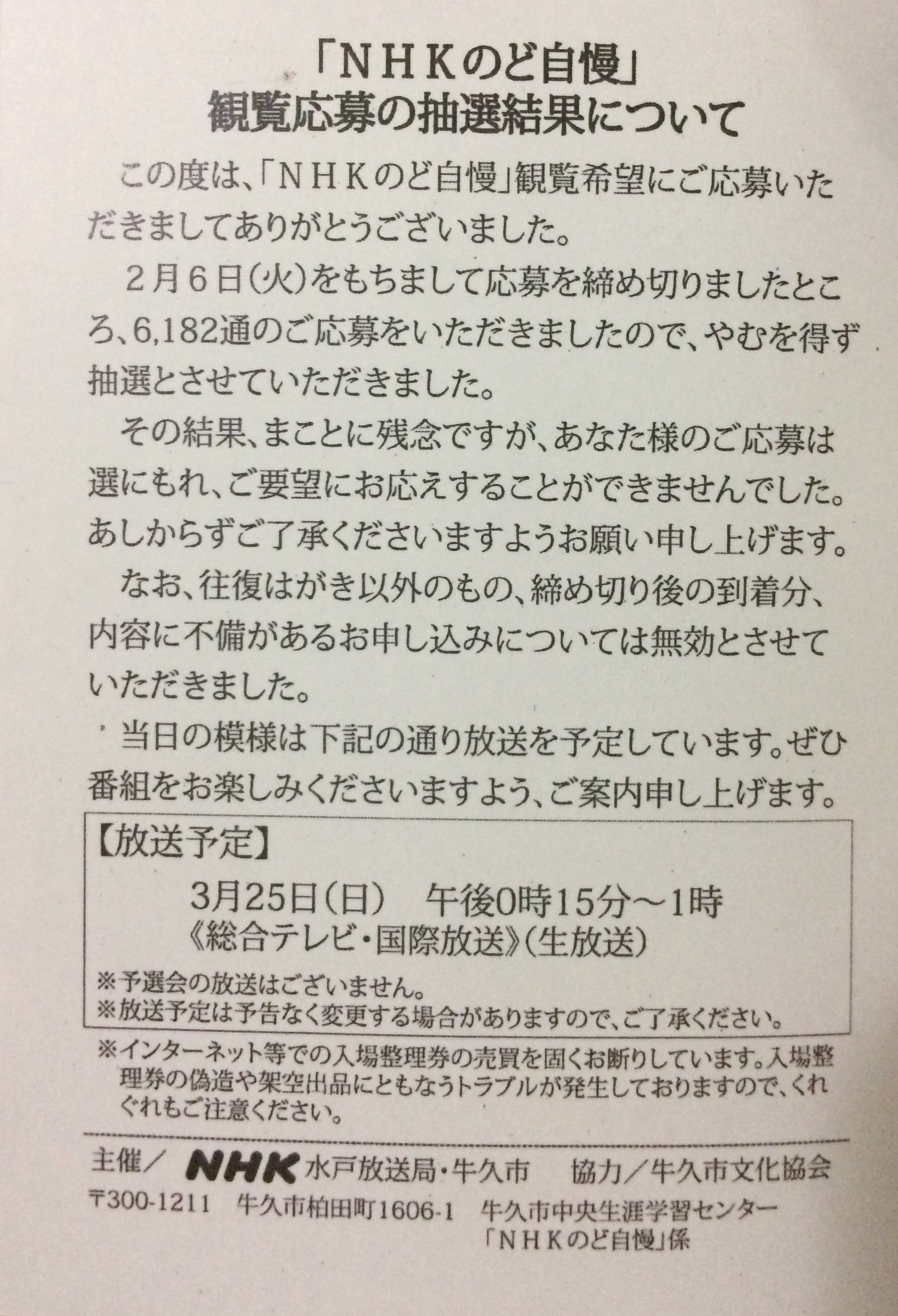モーニング娘。'18ゲストのNHKのど自慢の観覧落選したけども応募が6182通あったんだってさwwwwwwww
